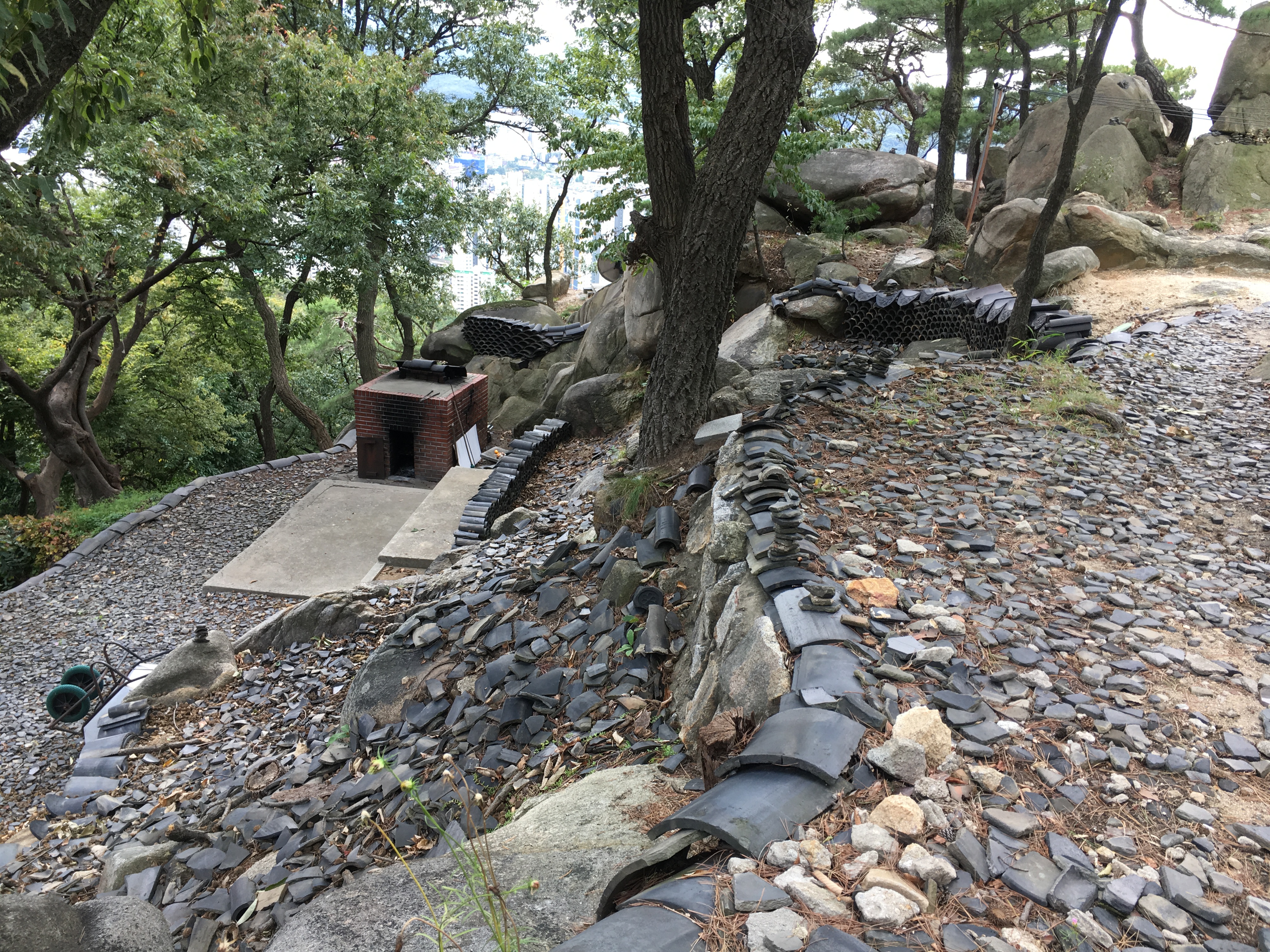 산비탈이 허물어 내리지 않도록 기와를 총총 덮어 놓았다.
