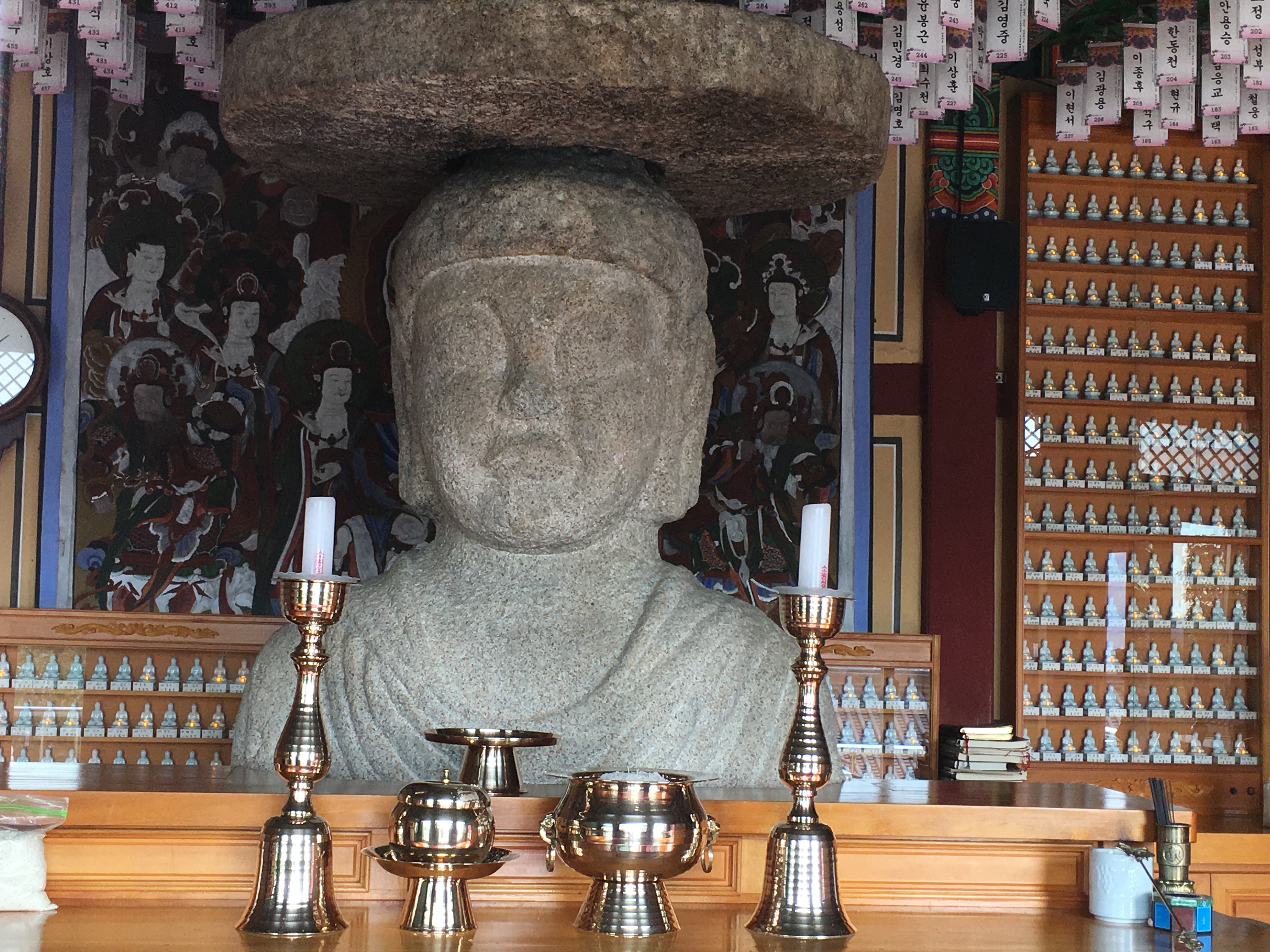 아무리 봐도 이런 불상은 주로 실외에서 발견할 수 있는 돌불상이 법당 안에 있다.